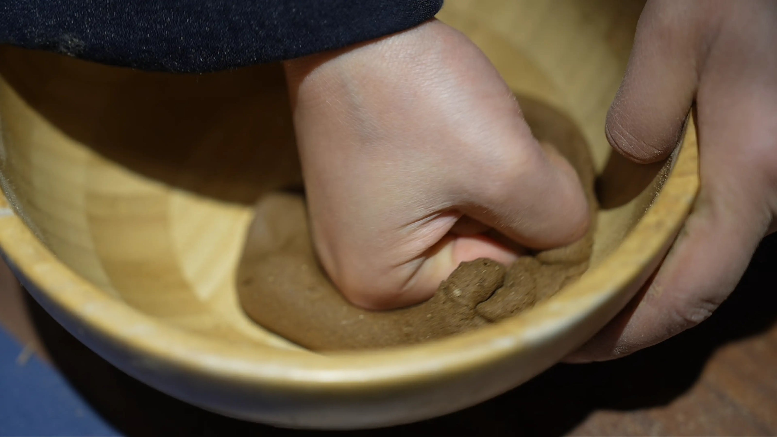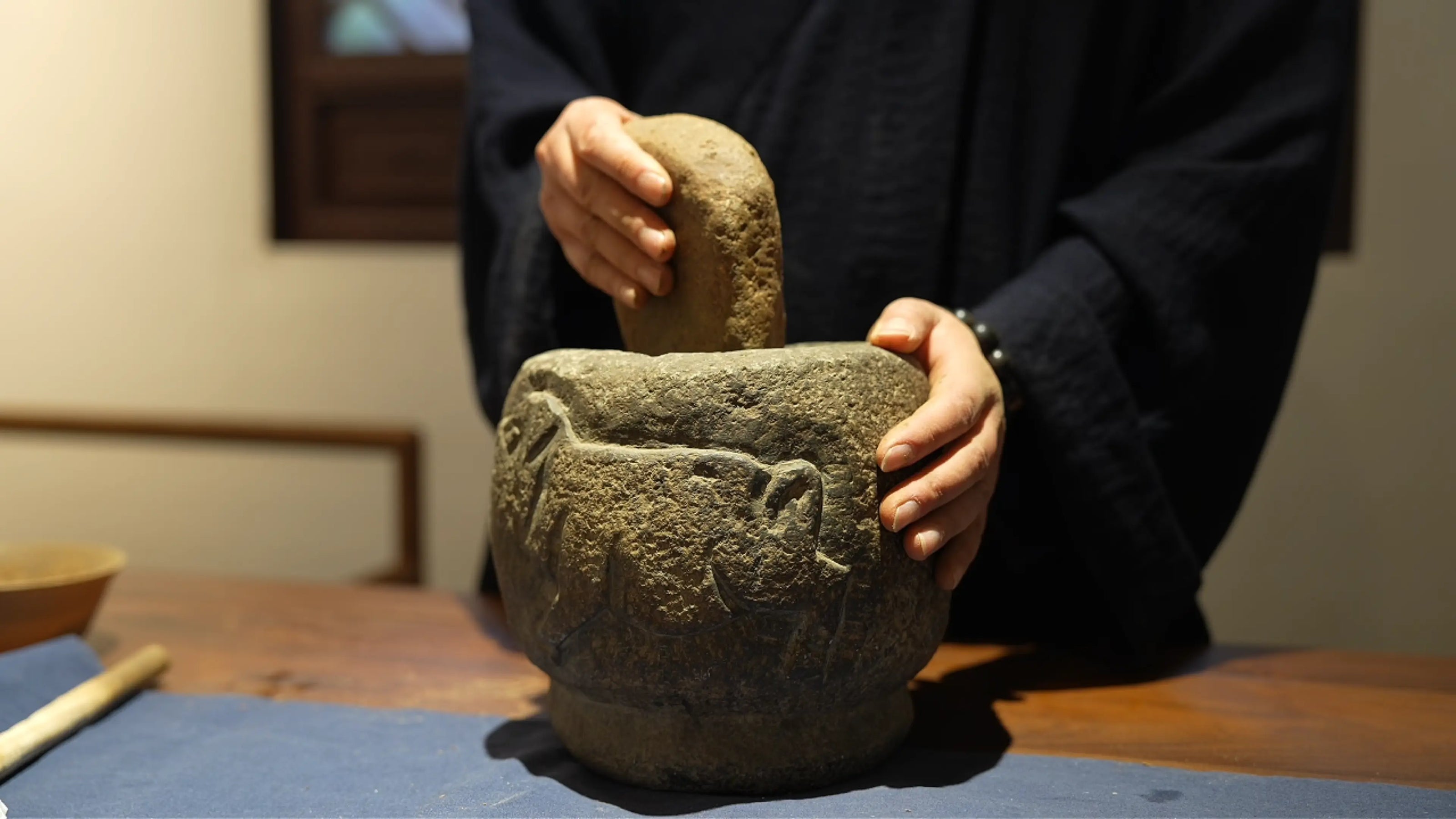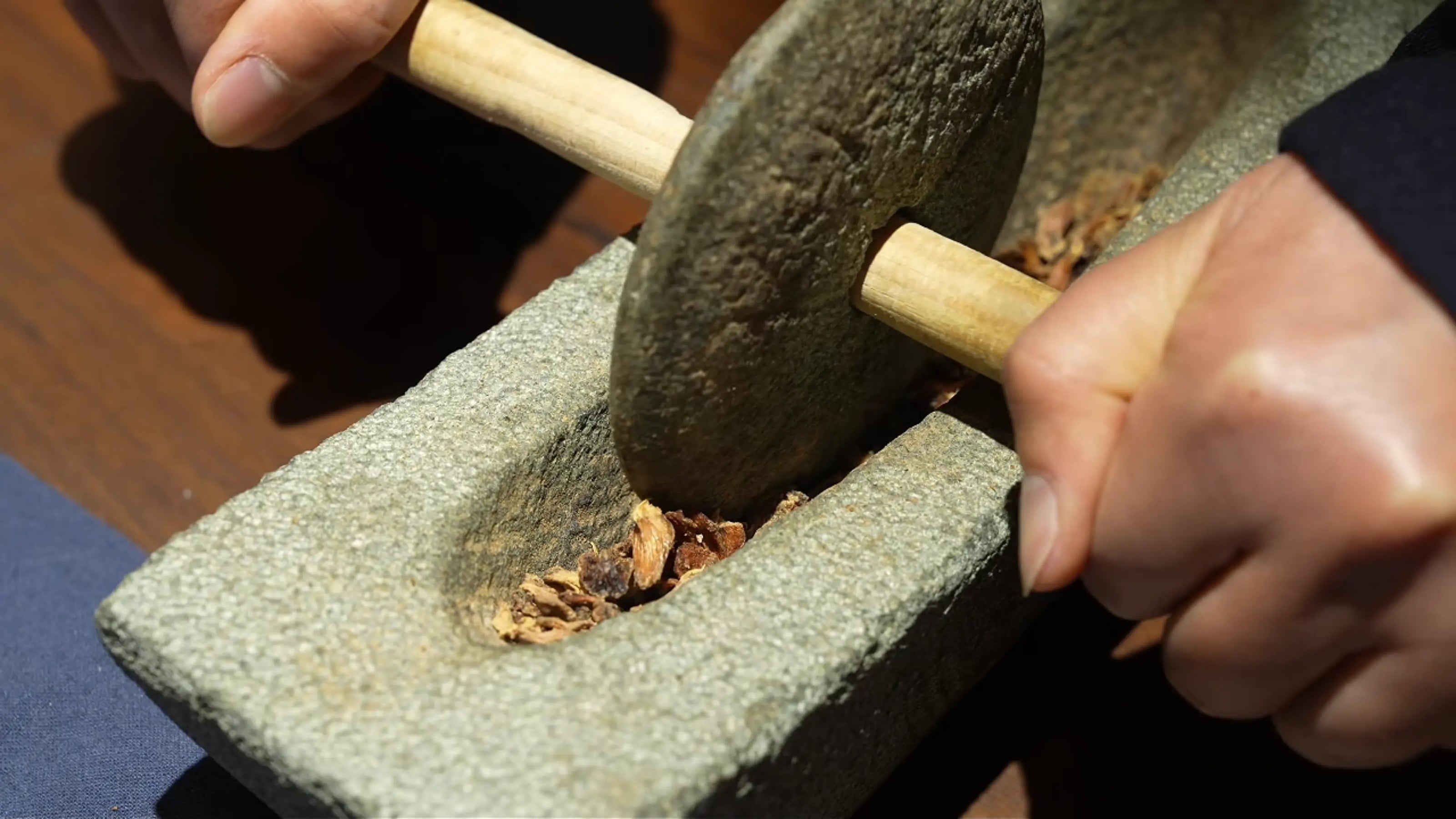 Herbs are ground by hand to create the base powder.